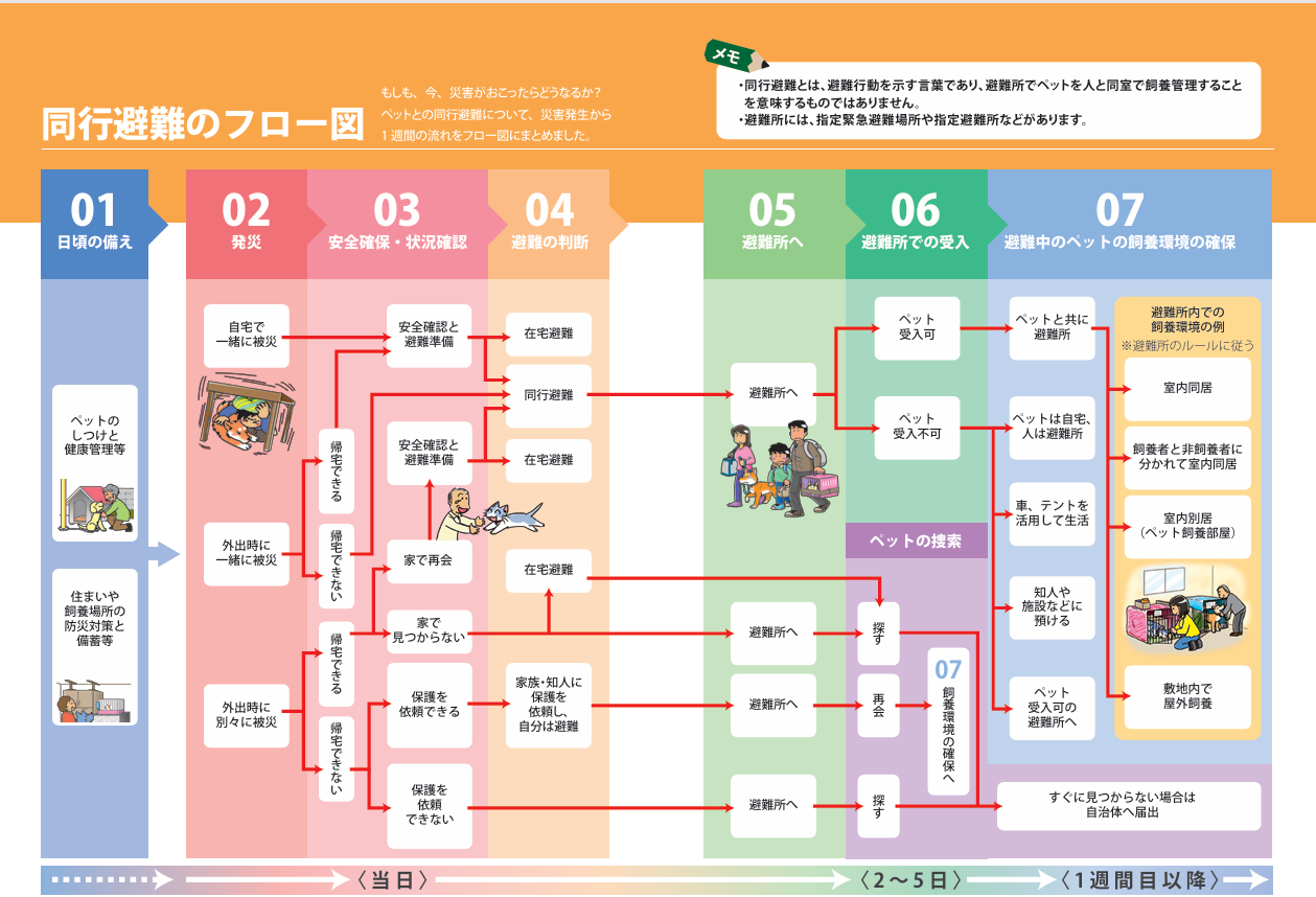 現在ご自分が住んでいる地域で指定されている避難場所は、ペットとの同行避難が可能かどうかをあらかじめ確認し、可能な場合はその注意事項を管轄の自治体に確認する等して、ペットとの避難計画を考えておきましょう。